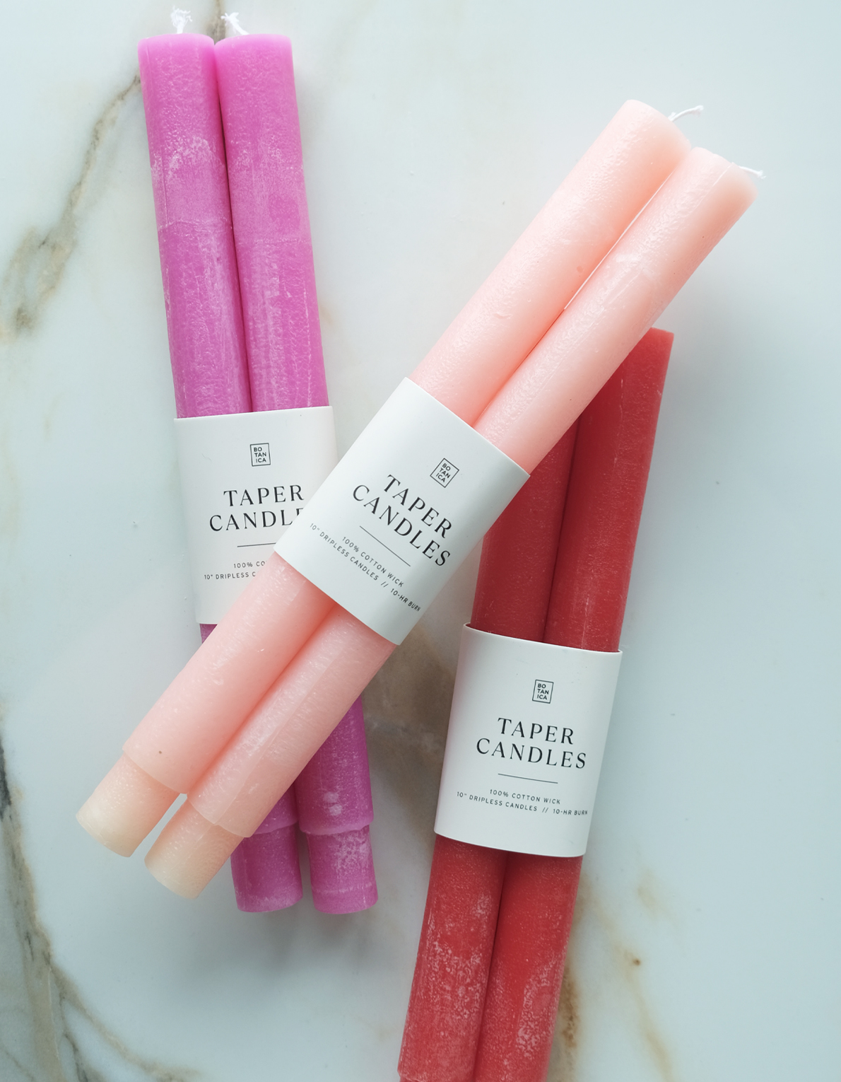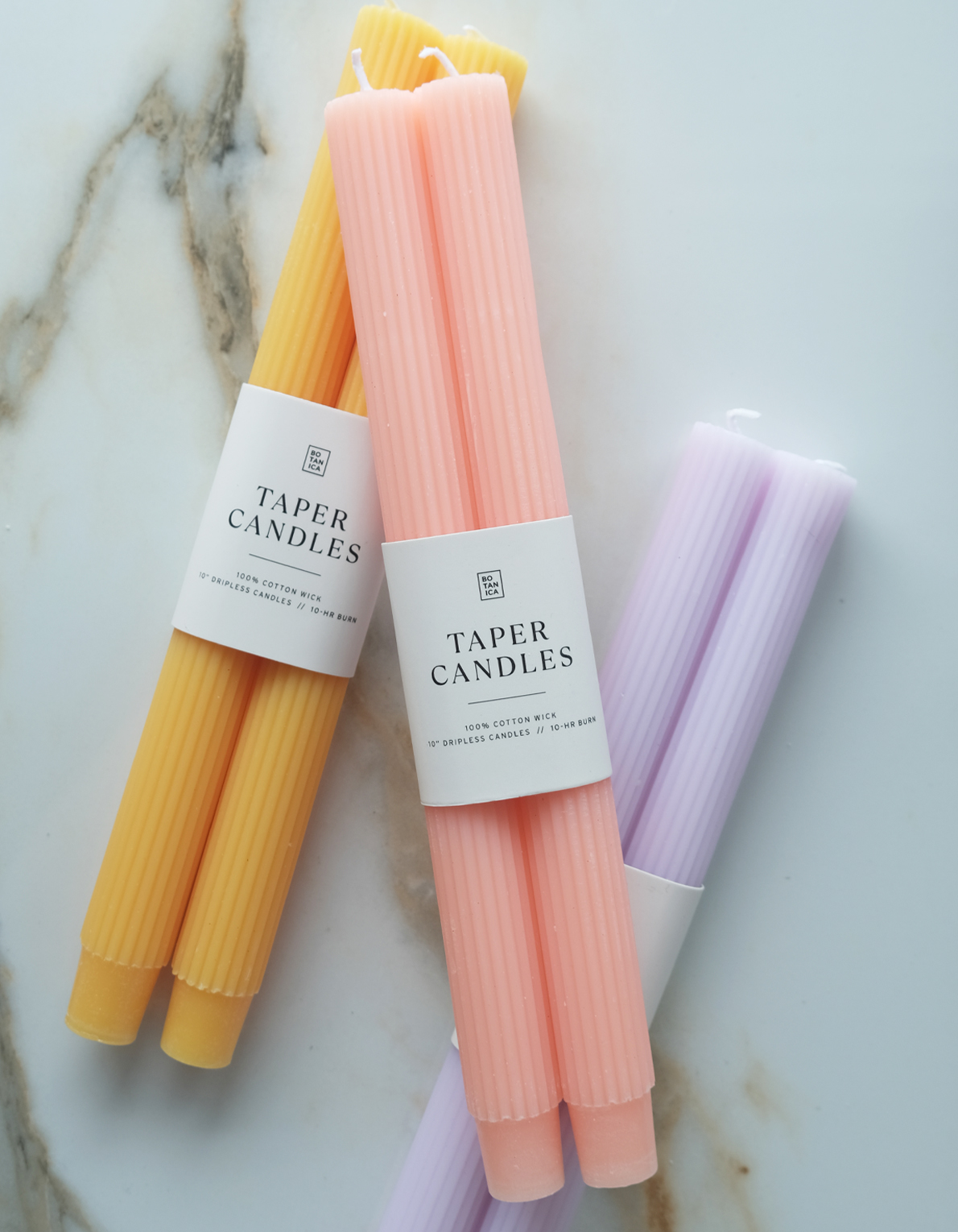 Botanica taper candles pairs are hand-dyed in an array of classic and sophisticated shades. Each candle is 7/8″ diameter, and burns for approximately 10 hours, available in classic pillar & fluted shapes.