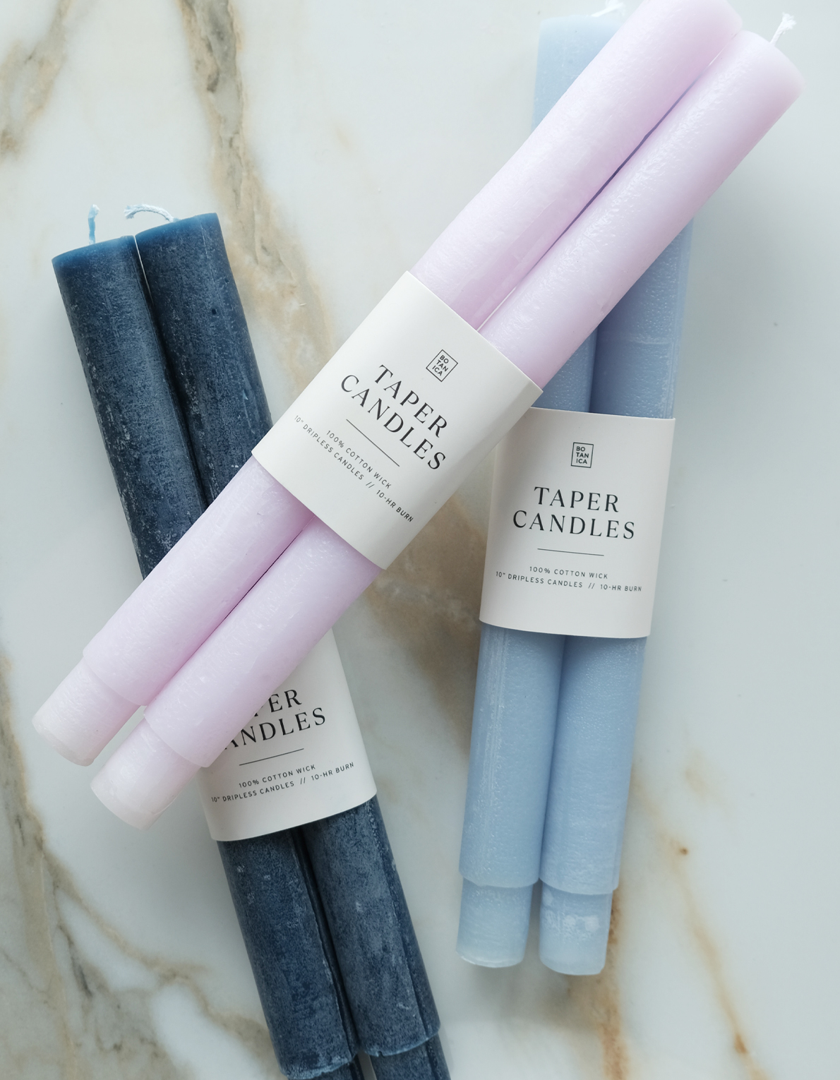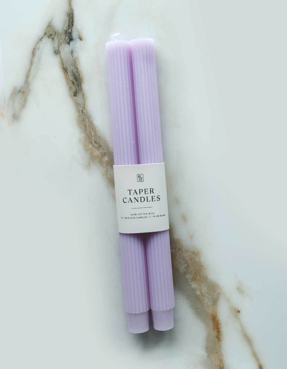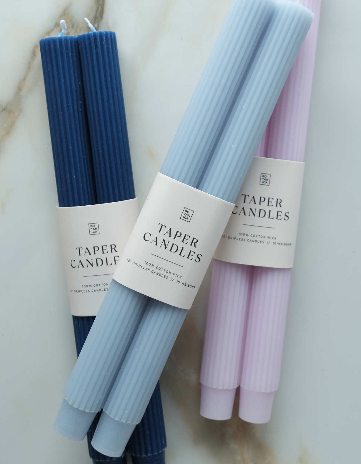 Botanica taper candles pairs are hand-dyed in an array of classic and sophisticated shades. Each candle is 7/8″ diameter, and burns for approximately 10 hours, available in classic pillar & fluted shapes.